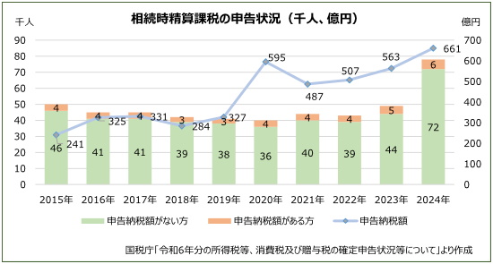 2025年(令和7年)5月に発表された資料です。申告人員は2019年分〜2021年分が翌年4月末まで、それ以前と2022年分以降は翌年3月末日までに提出された申告書の計数です。相続時精算課税に係る申告人員には、暦年課税との併用者を含んでいます。